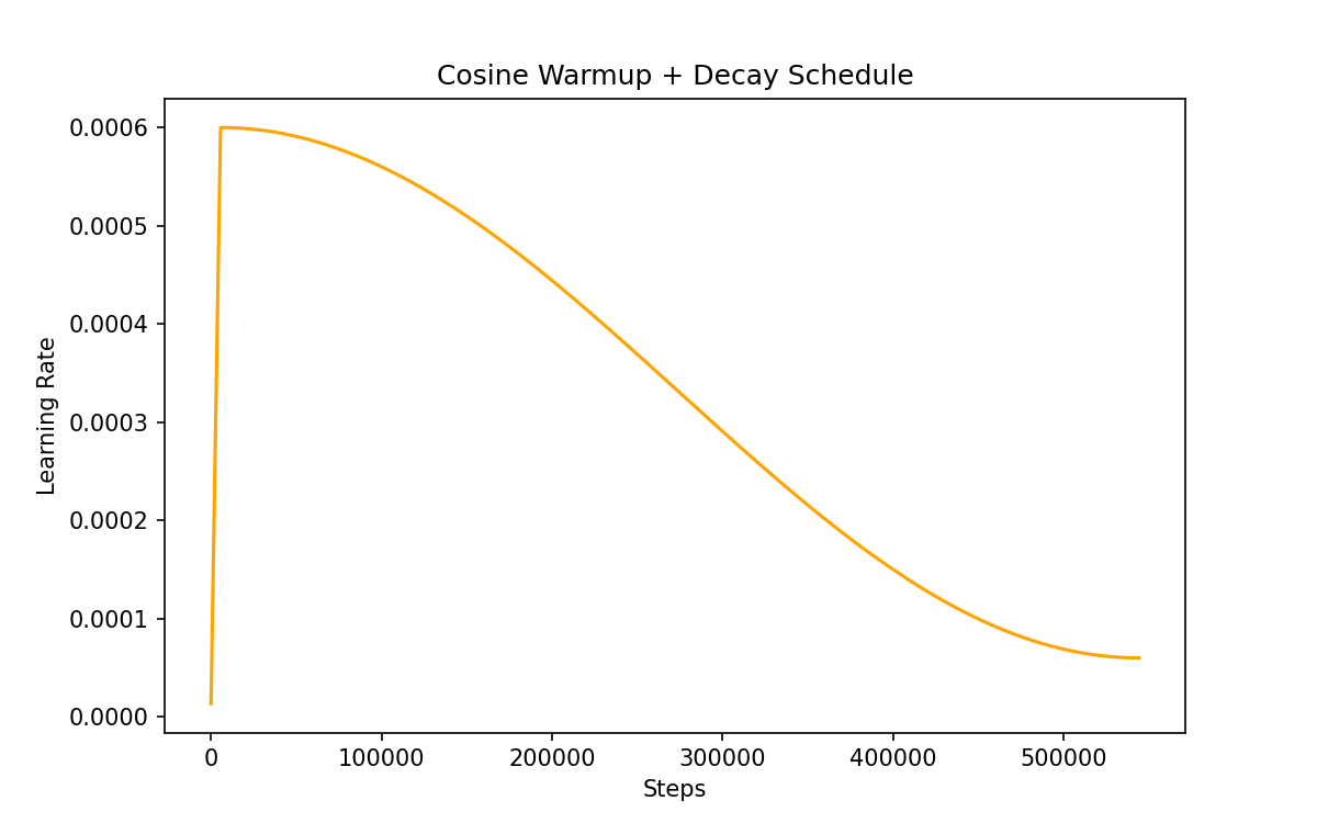 - Learning Rate Schedule (Cosine Decay) – To match the GPT-3 paper, I implemented a custom scheduler that linearly warms up the learning rate for the first steps and then decays it using a cosine curve. This approach smooths training: warmup prevents unstable updates at the start, while cosine decay gradually lowers the learning rate toward a minimum value so the model can converge more stably.